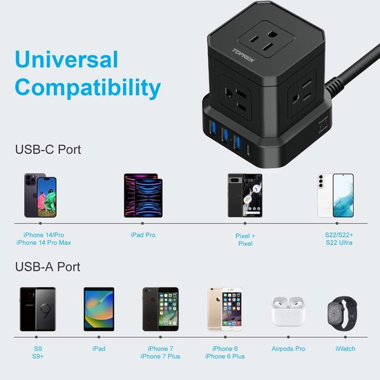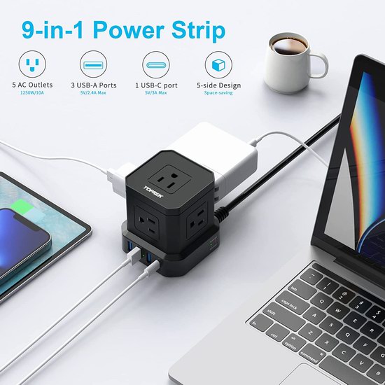 此款插线座搭载700焦耳浪涌保护,超紧凑方块设计,节省空间,内置5个插座口、3个USB充电口和1个USB-C充电口,单口提供5V/2.4A输出,总输出可达3.1A,电源线长达10英尺(3.05米)。