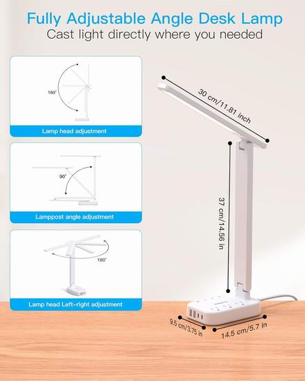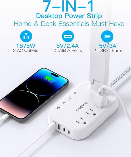 带LED台灯的电源条,3个插座,4个USB接口(2个USB-C),4种色温模式,5级触控亮度,无频闪、无眩光、无蓝光、无重影,保护视力,配备5英尺电源线。台灯内置2个USB-C充电口、2个USB-A充电口和3个三孔交流电插座,无论床头灯是否开启,都能为您的手机、平板电脑、Kindle、手表、加湿器等设备充电。