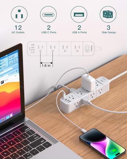 此款插线板内置12个插座口和4个USB快速充电口,每个端口输出可达5V/2.4A,搭载3个互补的浪涌保护电路,内置过载保护,在电流、电压、温度过大、短路时,可自动切断电源,15英尺耐用编织电源线,不易变形。