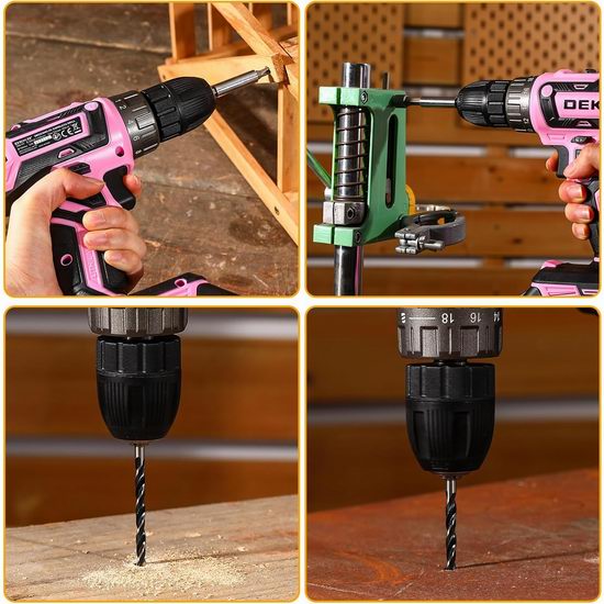 此款无绳电钻具有2档转速(0-350/0-1350 rpm),扭矩高达40N.m,18+1扭矩设定,使用20V 1.5AH锂电池驱动,整机净重仅2.5磅,女性也能轻松操作,附送多个批头和钻头。
