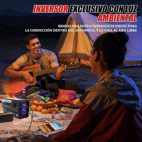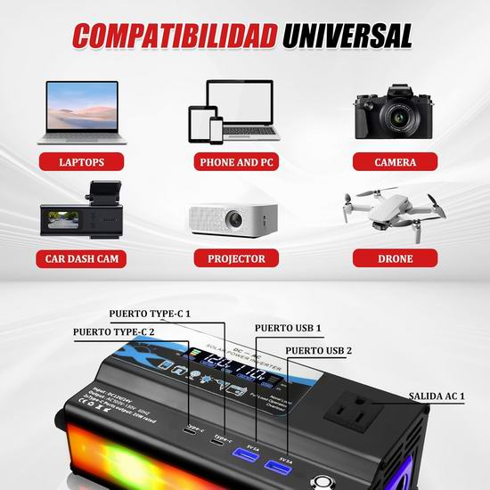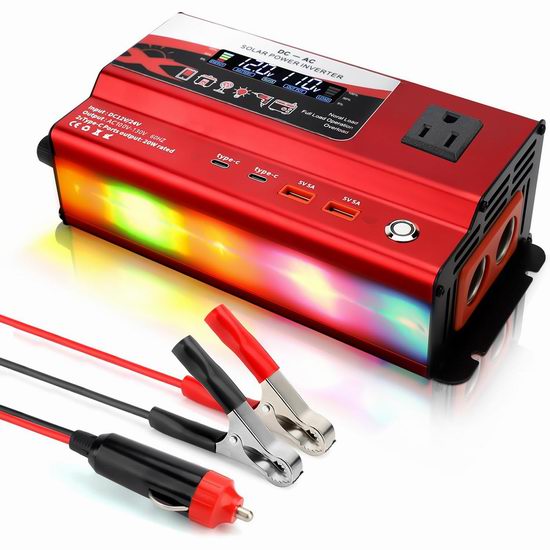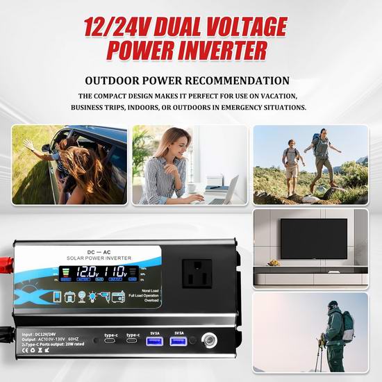 这款车载电源逆变器可将车载12V和24V直流电源转换为110V交流电,为笔记本电脑、咖啡机、冷藏箱、智能手机和其他设备提供电力。逆变器内置1个交流电插座、2个USB充电口、2个Type-C充电口和2个点烟器口。配备液晶显示屏,可显示输入/输出电压、电池电量和机器状态,方便监控。带有氛围灯,增强使用体验。
