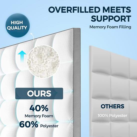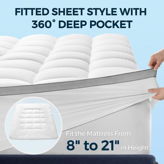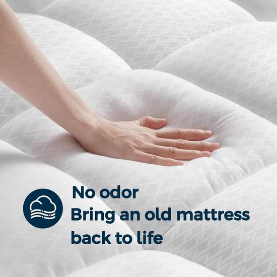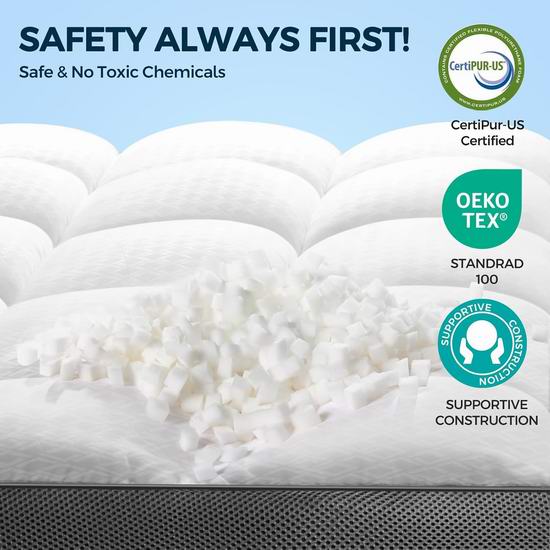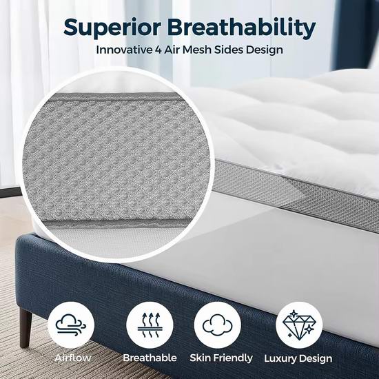 优化填充物配比,采用60%聚酯纤维和40%凝胶记忆海绵填充,提供理想的支撑和柔软舒适感。网眼透气设计,使空气可以从各个方向流通,促进空气循环,让您整晚保持干爽舒适。通过 OEKO STANDARD 100 和 CertiPUR-US 认证,确保材料安全无毒。弹力深口袋设计,适用于8-21英寸厚的床垫,无需担心床垫套滑动或发出噪音。
