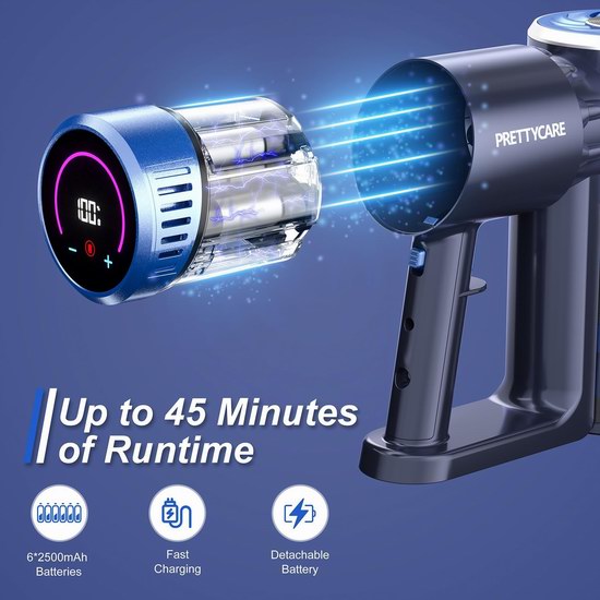 此款吸尘器采用六合一设计,内置无刷数码马达,拥有27Kpa强劲吸力,内置LED显示屏,实时查看剩余电量,2档吸力模式,具有4级全密封HEPA过滤系统,高效过滤99.99%的灰尘、花粉、细菌和尘螨等。轻便易操控,可从立式吸尘器转换成手持式,配备多个吸头,实现6种吸尘模式,从地板、楼梯清洁到天花板的清洁都能搞定,吸头带LED照明灯,续航时间最长可达45分钟。