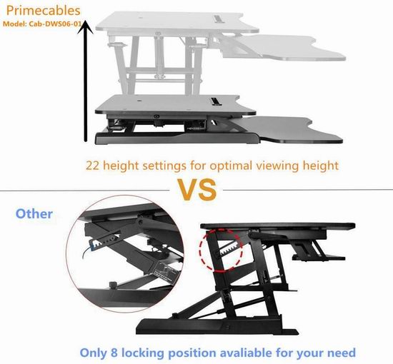 此款支架可用于放置显示器或笔记本电脑,高度可在10.6-50厘米之间调节,22级高度选择,方便站姿使用电脑,最高承重33磅,31.5英寸全尺寸台面足以放下两台显示器,内置键盘托盘和手机平板槽。外形尺寸为87 x 52 x 17.5厘米。