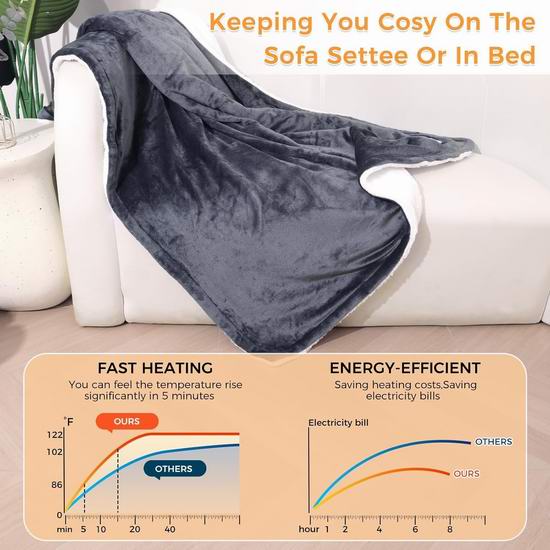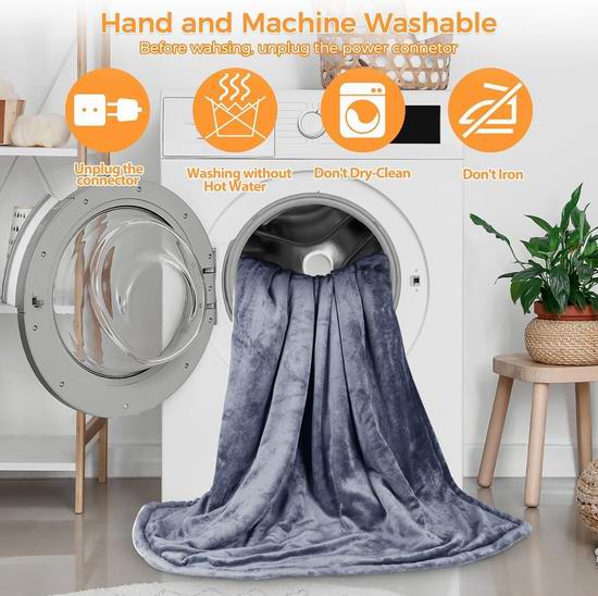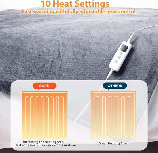 这款电热毯采用柔软的法兰绒和夏尔巴绒制成,厚实保暖。支持10档热量设置,0-9小时定时关闭,具有过热和过流保护系统,确保安心使用,同时符合 ETL&FCC&ICES 认证。电热毯的遥控器和线缆可拆卸,方便机洗。尺寸为50x60英寸。