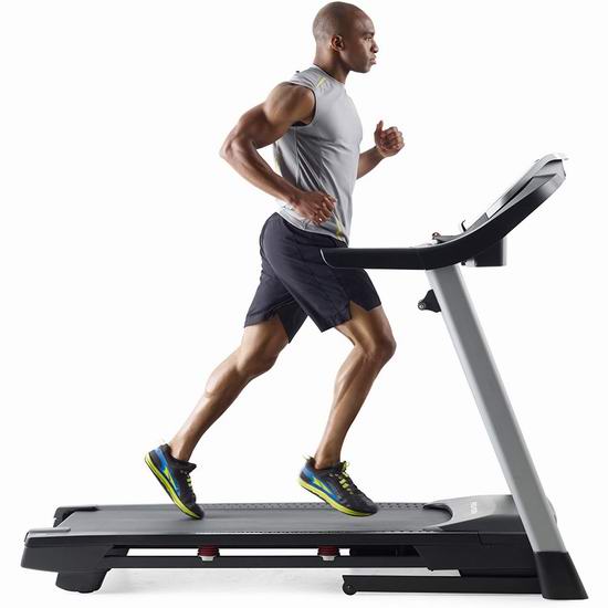 采用2.5 chp大功率电机,ProShox避震缓冲系统,内置15个预设锻炼程序,0-10%快速倾斜控制,最快跑步速度可达每小时10英里,5英寸背光显示窗口,清晰易读,集成平板电脑支架,内置立体声扬声器,最大承重325磅。尺寸为210.8 x 76.2 x 30.58厘米。