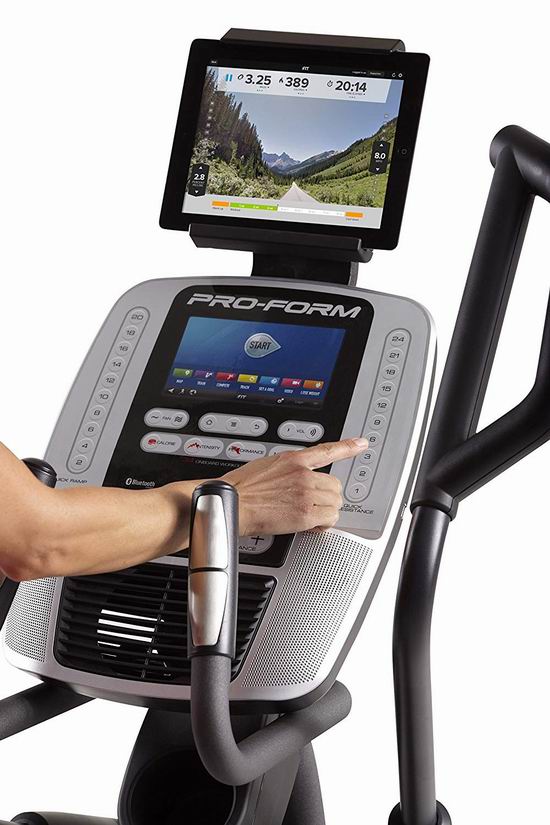 此款椭圆机采用商业级钢结构,具有35组预设锻炼程序,26级数字阻力,0-20度倾斜度可调,把手可检测心跳,配备无线胸带,配备7英寸超大全彩色触控屏,可显示时间、消耗热量、速度、距离、心率、转速等数据,内置风扇和音箱,兼容iPod,承重375磅,厂家提供5年零件质保和2年人工保修服务。