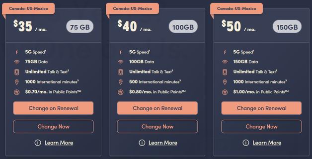 老用户可在后台切换套餐加入5G速度 美加墨漫游75GB流量+1000分钟国际长途通话月计划,仅需35加元;点击进入订购页面。