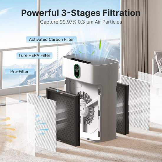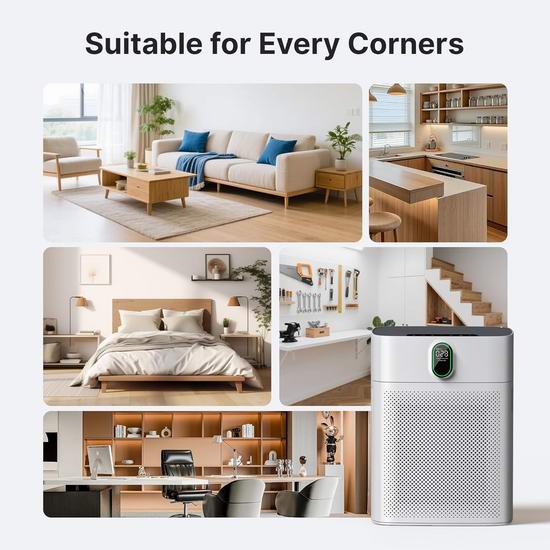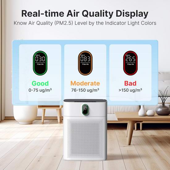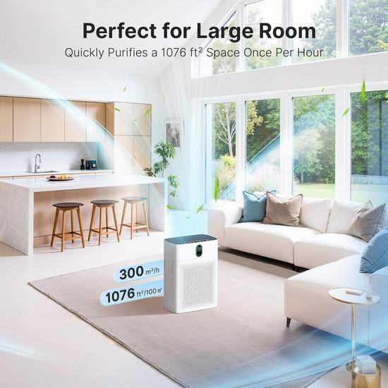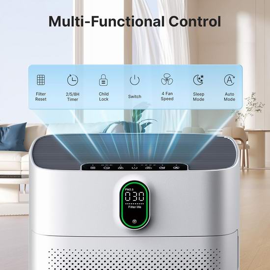 这款空气净化器配备高性能HEPA空气净化器,采用双侧进气和True HEPA滤网,使气流翻倍,从而提升净化效率。其CADR值高达300立方米/小时,每小时可高效净化高达1076平方英尺(约100平方米)的空气。搭载PM2.5传感器,可检测颗粒物并通过颜色编码指示灯实时显示空气质量。在自动模式下,它会自动调节风扇速度以应对污染空气,非常适合去除野火烟雾、花粉和异味。在睡眠模式下运行噪音仅为24dB,所有指示灯均关闭,几乎静音,不会打扰睡眠。提供4档手动风速和3档定时(2/5/8小时)。自动模式可实现免手动操作,根据空气质量智能选择合适的风速。