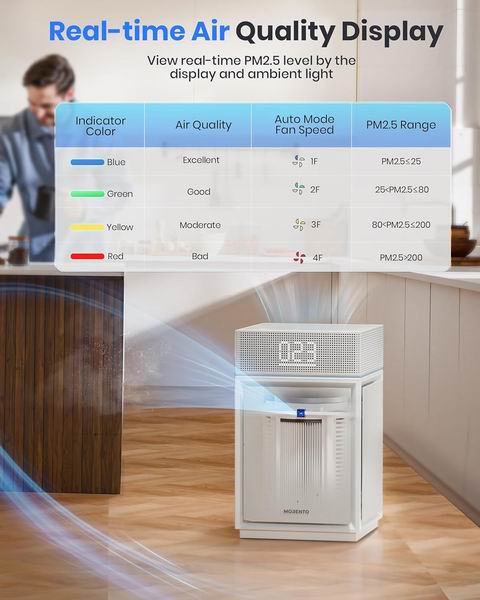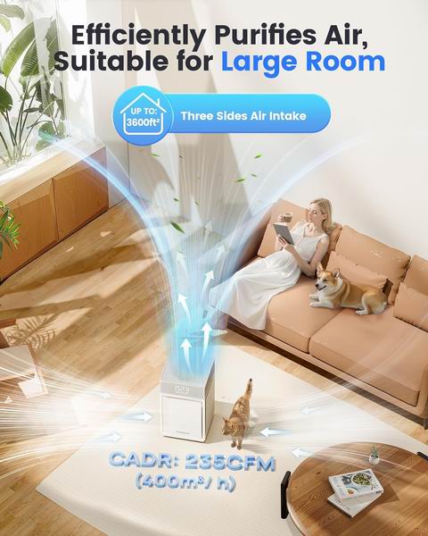 Pureborne PB6866 空气净化器适用于家庭大房间或卧室,最大净化面积约3600平方英尺,采用三面进风设计提升空气循环效率,搭载H13 True HEPA三层过滤系统,可有效去除灰尘、宠物毛发、烟雾和异味;配备PM2.5空气质量传感器与实时显示屏,可根据空气状况自动调节风速。支持4档风速与1–12小时定时功能,睡眠模式低噪运行并自动关闭灯光,配有儿童锁和可拆卸静音万向轮,移动方便,适合客厅、卧室或办公室使用。