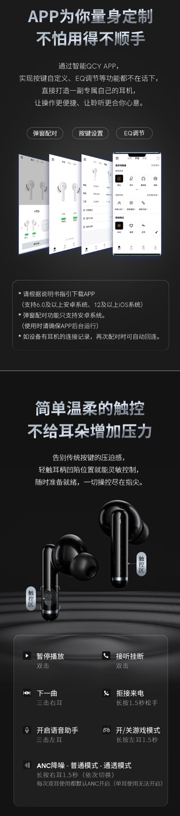 QCY HT03外观设计的灵感来源于暗夜星空,表面采用了UV高光喷漆工艺,因此耳机表面布满细闪,在光线下会呈现出晶莹剔透、熠熠生辉的状态。且整体为简约风的流线型设计,圆润的外观使得耳机摸起来触感细腻舒适。QCY HT03降噪深度高达35dB旗舰级别,通过前麦和后麦精准捕捉环境与耳道噪声,迅速产生反向音波抵消杂音。同时,还搭载了10mm大尺寸动圈喇叭,低音清晰厚实、三频均衡,让你随时在任何吵杂环境中都能享受宁静的音乐时刻。HT03耳机前腔较小,加之耳帽处为亲肤性好的软硅胶材料,大大提升了使用者耳机佩戴时的舒适度;并且,HT03在耳柄处设置了一个凹陷处,用户可以快速找到触控位置,在使用过程中享受更智能化、更人性化的佩戴体验。单次充电续航时间6小时,配合充电盒续航长达24小时。