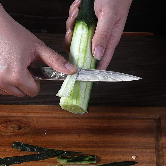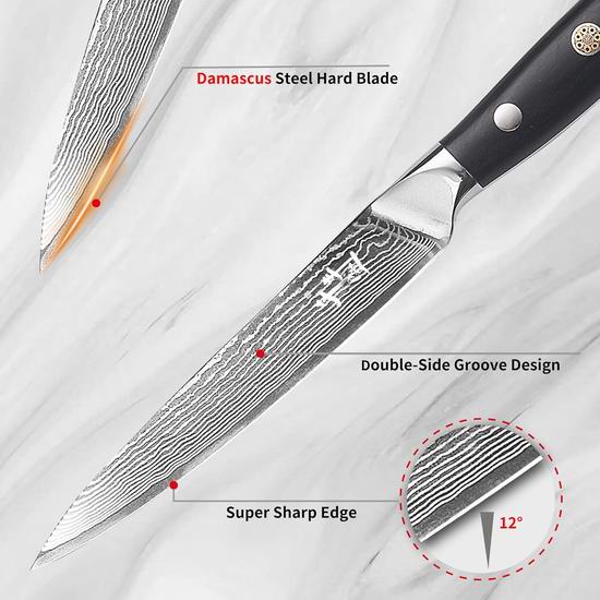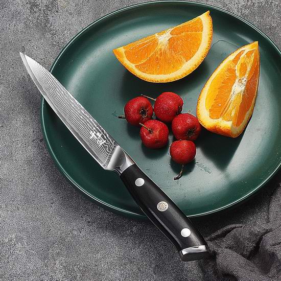 这款多用途厨刀由 67 层优质大马士革不锈钢打造而成,呈现出美丽的云纹,由碳钢薄片经精细折叠锻造和高温热处理而成,具有卓越的强度、防锈性和耐腐蚀性,洛氏硬度高达 62,切割角度为 12-15 度,拥有卓越的锋利度,能轻松切开食材,保持食材新鲜,并确保切口干净利落,带来更愉悦的烹饪体验。手柄采用舒适的椭圆形设计,完美贴合手型,由木材制成,握感牢固,有效减少手部疲劳。