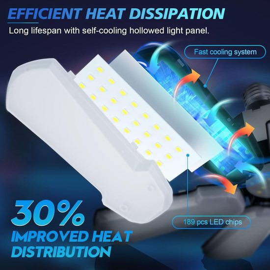 此款车库灯采用紧凑型设计,6+1可变形灯头,具有15000流明超高亮度,无暗区、重影或眩光,使用寿命超过50,000小时,可6500K产生日光照明效果,功率仅150瓦,照明面板角度可调节,兼容标准E26/E27灯座,无需工具,可直接装在普通灯座上使用,非常适合室内照明和车库照明。