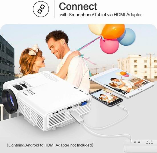 此款投影仪采用最新的7P LCD技术,可提供高清投影质量,图像亮度(颜色亮度和白色亮度)比其他同类型投影机提高80%,支持HDMI、AV、USB和VGA等多种输入方式,与笔记本电脑、游戏机、台式机、机顶盒、DVD播放器、摄像机、监视器等连接后播放电影、视频或游戏,支持播放1080P视频,物理分辨率为1280*720。通过调整与墙面距离(1-5米),可实现32-170英寸屏幕的投影。内置扬声器,提供 HIFI 音效,支持蓝牙5.2,可无线连接蓝牙耳机或蓝牙音箱播放音频。