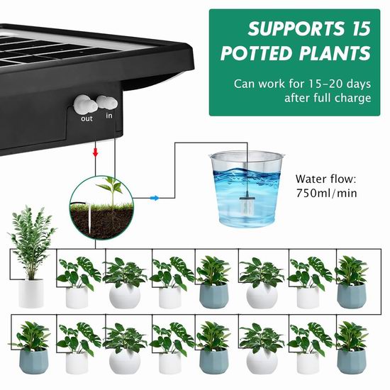 这款自动浇水系统由太阳能或USB充电供电,包含控制器、2000mAh锂电池、2.5W水泵和定时器,可为每株植物精准供水。支持自动和手动模式,自动模式可自定义浇水时长和间隔,手动模式随时启动浇水。系统配有59英尺管道、15个滴头等配件,可为花卉、蔬菜等设计专属灌溉方案。防水设计适用于室内外,支持全年使用。防虹吸功能确保水流顺畅,充满电后可为15株植物浇水15-20天。
