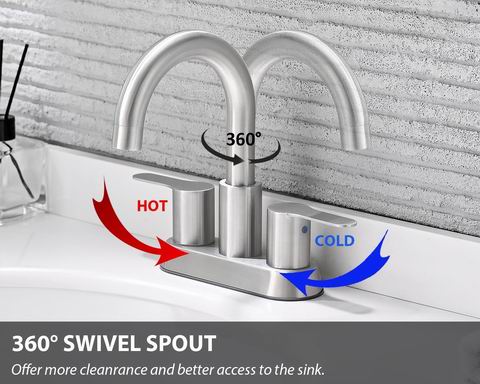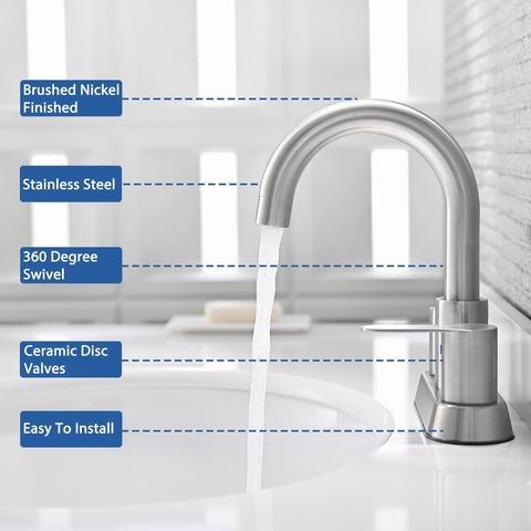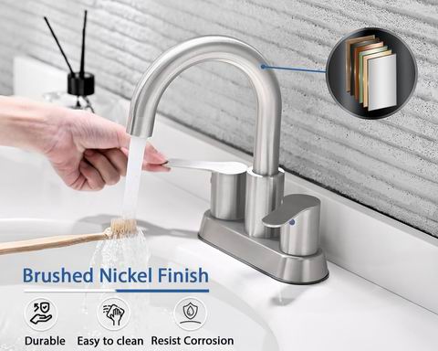 拉丝镍不锈钢双把手浴室龙头(BF020L),适配4英寸中心距两孔/三孔洗脸盆,配弹跳式下水器(带溢水孔)和两根不锈钢编织供水管,安装更省心。1.2 GPM CEC认证起泡器,减少飞溅并节水约20%。防滴漏陶瓷阀芯+90°旋转手柄,冷热控水顺滑;360°高弧出水嘴(高/伸出各5.12英寸)覆盖更全面。支持孔径1.26–1.57英寸、台面厚度至1.38英寸,按指南约15