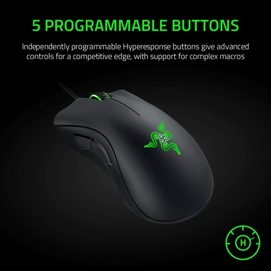 Razer DeathAdder Essential 雷蛇蝰蛇™标准版游戏鼠标沿用了符合人体工程学的经典外形,这是几代 Razer DeathAdder 雷蛇蝰蛇™产品都一直秉持的设计要素。其时尚而独特的造型专为舒适感而打造,在长时间的游戏中也能保持优秀的性能,让你绝不会在激烈的酣战中尽显疲态。5 个HYPERESPONSE 高速响应按键,独立可编程的 Hyperesponse 高速响应按键可让你实现精准的操控,获得理想的竞争优势。6,400 DPI 光学传感器,鼠标可以进行快速而精确的移动,因而满足了最基本的游戏需求,实现了更精准的操控。