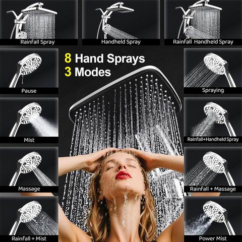 专利磁吸双花洒设计,包含固定式雨淋花洒+可拆卸高压手持花洒,强力磁吸底座稳固吸附;一体式支架角度可调,轻松找到最佳雨淋角度,精准覆盖肩背更省力。12英寸方形大面板雨淋花洒带来全身包裹感,自清洁喷嘴不易堵塞。手持花洒提供9档强劲模式含涡轮喷射,适合冲洗、清洁浴室、宠物护理或强力按摩;两种模式可快速切换,兼顾放松与高效清洁。