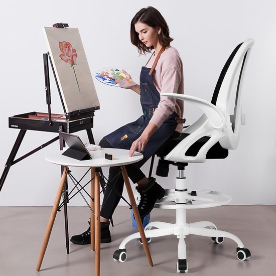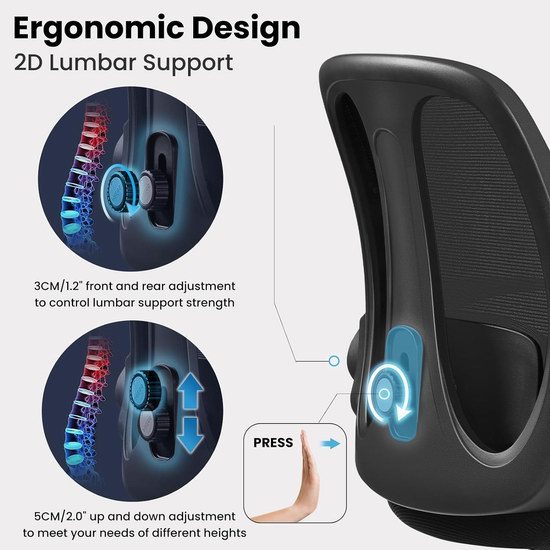 符合人体工学设计,贴合背部自然曲线,网眼靠背,通风透气,配有可调节位置的2D海绵腰部支撑,提高个性化舒适度和保护,减少长时间坐姿引起的背部疼痛。扶手可向上翻转90度,下面配备搁脚环,座位高度可调。