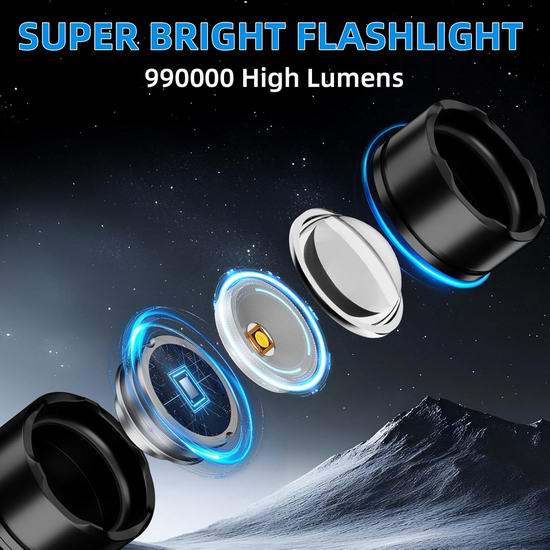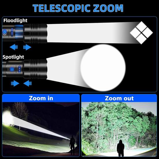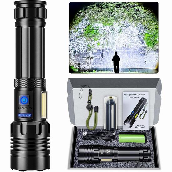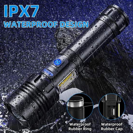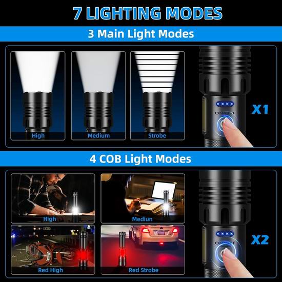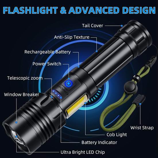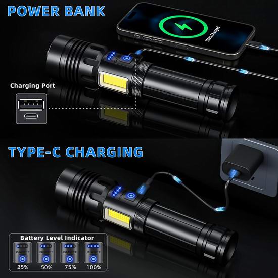 DSOCU P90 手电筒内置先进的 P90 LED 芯片,拥有强大的 990000 流明输出,比其他普通手电筒亮30倍。照亮面积达3280平方英尺的房间,并可轻松聚焦至4921英尺外的物体。提供长达 16 小时的续航时间,并配备升级的过充保护功能,可通过 Type-C 数据线充电,具有USB 输出功能,甚至可以用作移动电源为手机供电。具有 7 种照明模式:3 种主要照明模式:高-中-频闪。4 种 cob 灯光模式:高-中-红色高-红色频闪。可以拉伸高流明手电筒的头部来调整焦距,自由选择远距离观察和广范围照明。手电筒采用航空级铝合金制成,坚固耐用,不易生锈。IPX7防水后盖和充电口采用橡胶圈密封设计,防止雨水渗入。,在紧急情况下为您的设备充电,提升您的户外体验。