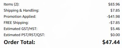 如下图所示,购买2套2件套,结账自动减价,总价税前41.98加元,单件仅需10.49加元:
