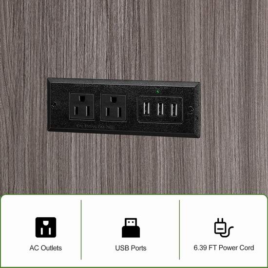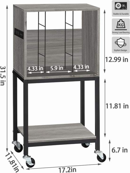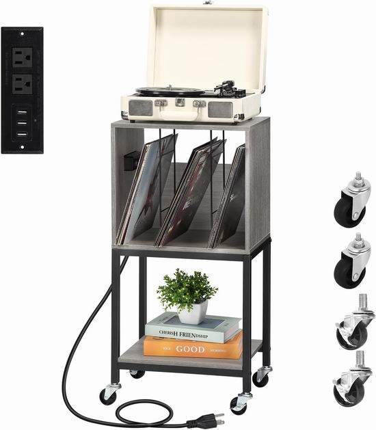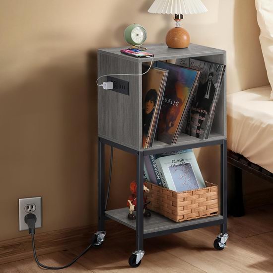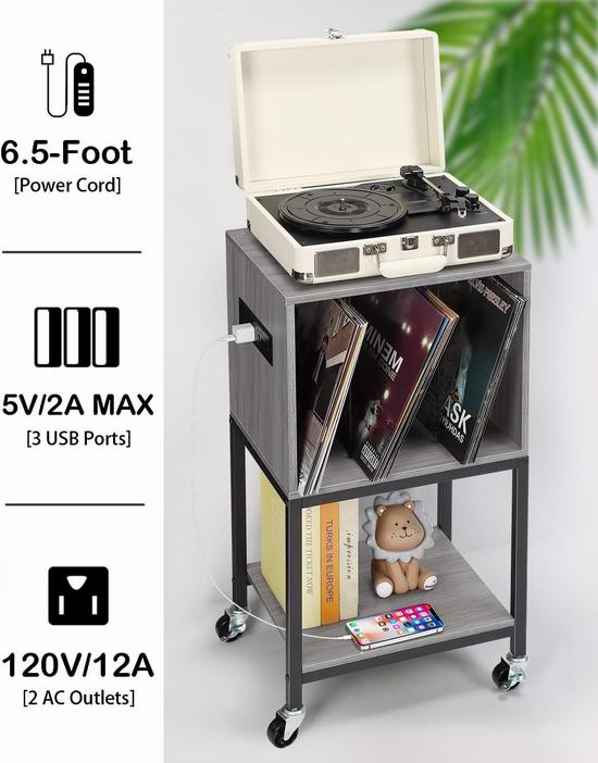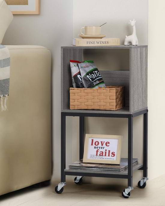 这款边桌采用优质刨花板和加厚碳钢金属框架制成,三层结构,中间层配有三个可拆卸的金属丝架,可以分类放置书籍报刊或唱片,侧边内置插线板,配备2个插座和3个USB充电口,电源线长达1.93米。配备可拆卸可锁定滚轮。外形尺寸为39.9 x 30 x 80.1厘米。