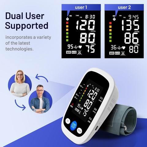 大尺寸背光LCD清晰易读,配精准可调节数字袖带(22–42cm),带袖带自检,测量更舒适更准确。支持一键开始/停止,约1分钟出读数。双用户99组记忆(共198组),含日期时间戳,并可计算最近3次平均值。两种供电方式:4节AAA电池(不含)或USB-C数据线(不可同时使用)。