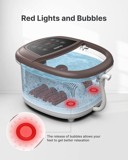 采用气泡舒适按摩,强力水波震荡,水温可控(35℃-48℃),3种自动按摩模式(连续滚动、均匀时间间隔和不等时间间隔按摩)及 气泡喷射功能在足浴按摩时提供强力气泡,可有效放松脚底,为您的足浴按摩增添更多舒适感;从低温逐渐升高温度,通过水、按摩滚轮和热量来提供温暖并改善血液循环,助于缓解疼痛、压力、紧张和焦虑。足浴默认按摩时间为15分钟,计时器设置为 10 到 60 分钟,足部按摩机水疗适合老年人、失眠者、运动员、脚冷的人等。现代医学认为,脚是人体的“第二心脏”,脚部有大量神经末梢与大脑紧密相连,还密布着许多血管。脚底部从足趾到足跟依次分布着人体的头、颈、上肢、肺、心、肝、胃、十二指肠、肾、小肠、膀胱、下肢等部位的对应区。用热水泡脚或按摩脚底时,其作用会影响到全身各部分,从而对人体整体实施调节,达到促进睡眠,防治疾病的目的。