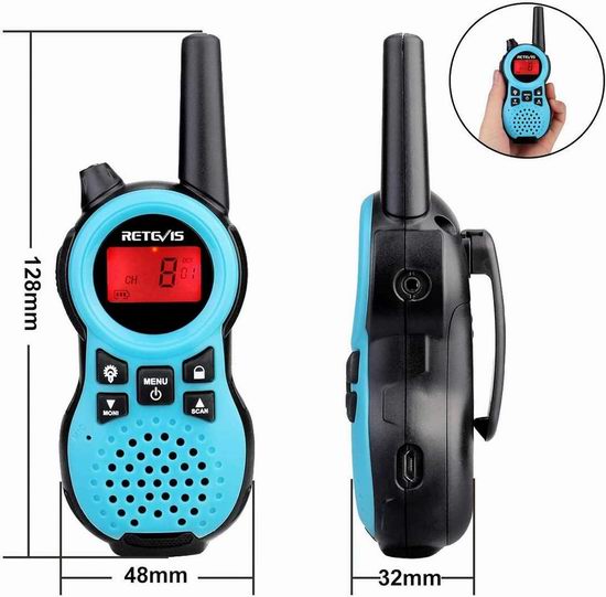 Retevis RT38儿童对讲机,设计轻巧便携,超薄机身设计适合孩子的手掌大小,具有22个频道和每频道121个代码,确保通话的清晰和连续性,操作简便。内置手电筒,适合夜间探险、紧急情况或黑暗工作环境使用。音质清晰,音量可调,内置10种呼叫铃声,为孩子提供完美的通话体验。VOX功能让小朋友可以无需按下按钮直接对着麦克风说话,方便使用。最大通话范围为1公里。