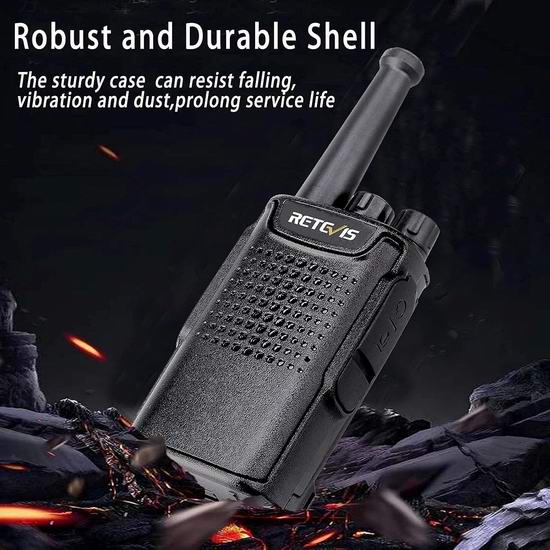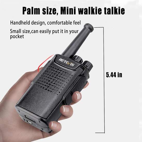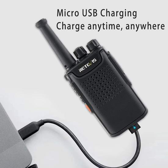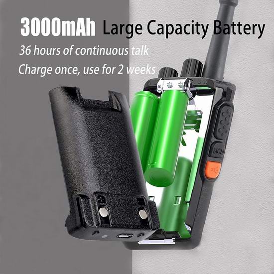 这款对讲机无线电的频率范围为 462.55 MHz 至 462.725 MHz,内置3000mAh可充电电池,续航时间长达15小时,配备USB充电器,内置LED照明灯,配备夹子可将对讲机固定在腰间。根据顾客评论,对讲机的有效范围可能在1.5公里左右。