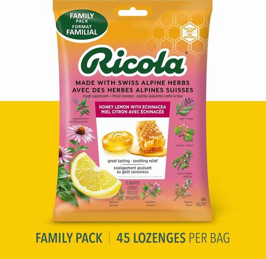 Ricola 蜂蜜柠檬紫锥菊止咳润喉糖(45粒)7.5折 6加元!2款可选!