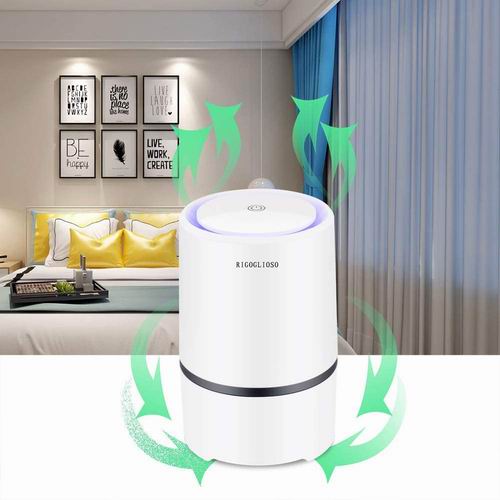 采用紧凑型设计,USB供电,一键式开启,内置HEPA过滤器,可去除小至0.3微米的空气污染物,改善空气质量,具有8小时自动关闭功能,内置蓝色小夜灯,适合用于10平方米的房间。