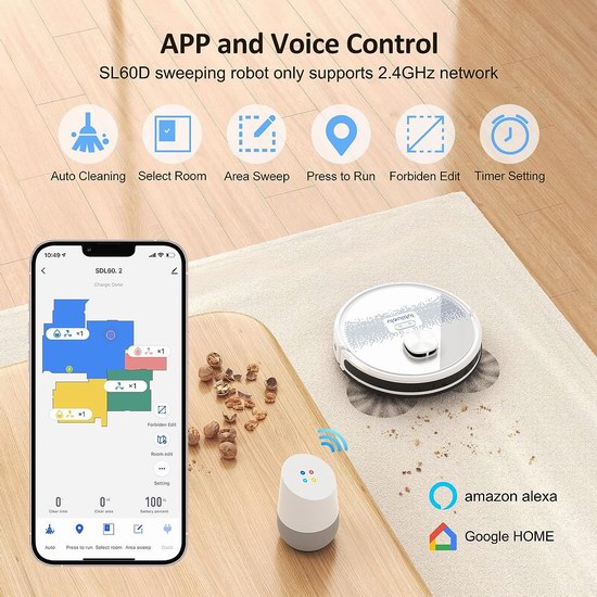 这款扫拖一体机器人搭载四核RK3308芯片,采用先进的激光雷达导航,8米测距,建图精度比普通激光导航高3倍,测绘速度更快,路线规划更高效,配合即时定位与地图构建(SLAM)智能算法导航,时刻保持清洁效果,配合升级版AI识别技术,精准避障。可以保存5张地图,多层无需反复建图。自动分房清扫,识别每间房间,避免反复清扫,可根据实际需求避开无需清扫或拖地的区域,最多可设置10个禁区。升级4000pa超强吸力,具有自动清扫、边缘清扫、分区清扫、定点清扫、双重清扫、定时清扫、Y型拖地等多种模式,结合3挡吸力调节,灰尘、毛发全搞定。电控水箱,拥有精密微控水泵,3档水量调节。内置2.4G WiFi,支持Amazon Alexa 或 Google Assistant语音控制。