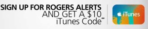 Limited time offer while supply lasts for eligible customers who sign up for RogersTM Alerts service and subject to change without notice. Available to Rogers Wireless Postpaid customers who sign up on RogersTM Alerts service for the first time. As a thank you for signing up, you will receive a $10 iTunes Code. $10 iTunes Code must be claimed within 90 days of signing up for this service. One offer per customer, may not be combined with any other offer.