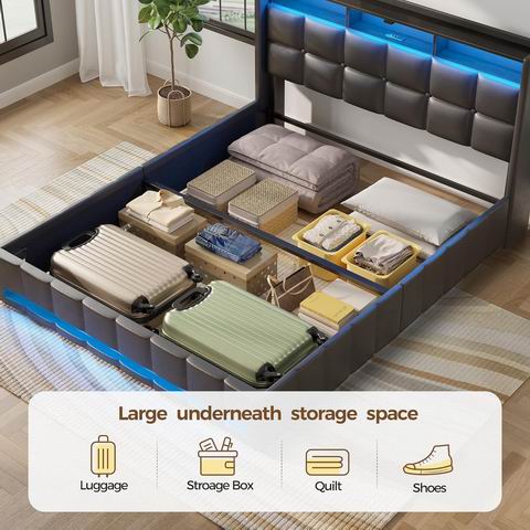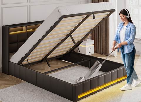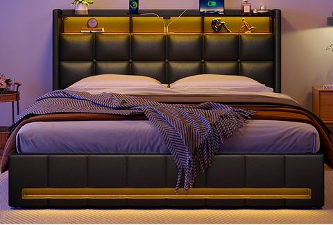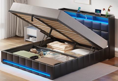 采用液压升降设计,可轻松抬起床板,释放下方大容量储物空间,同时配备双层床头储物架,方便收纳手机、眼镜与书籍,提升卧室整洁度。床头与床尾内置 RGB LED 灯,提供 12 种场景模式、3 档速度和 3 档亮度调节,营造沉浸式睡眠氛围;床头板还集成 2 个 USB 接口和 1 个 USB-C 充电口,满足多设备充电需求。结构采用高强度木条与坚固金属框架支撑,无需弹簧床垫,建议搭配 6–10 英寸床垫(10 英寸更佳),静音设计有效减少异响。整体结构稳固耐用,采用 FSC 认证木材制造,所有部件清晰标注,单箱包装,安装便捷。