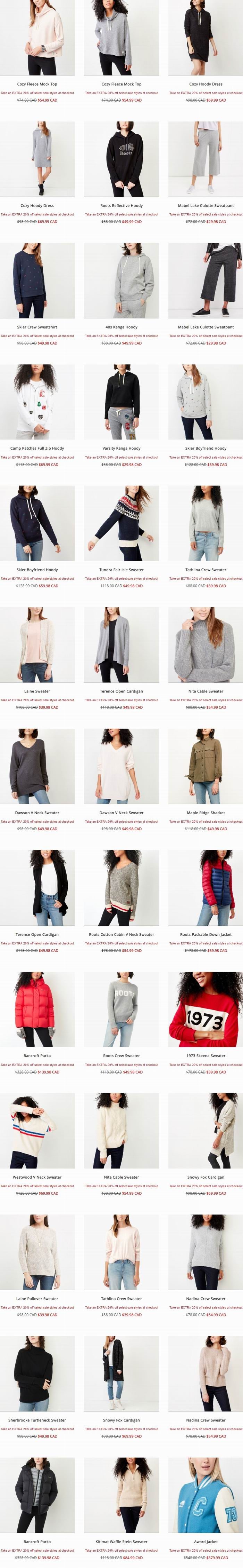 Roots网店销售,精选成人儿童服饰、鞋靴4折起,额外8折,无需折扣码,加入购物车自动打折,满50加元包邮。点击进入订购页面:Sale女士区、Sale儿童区、Sale男士区。