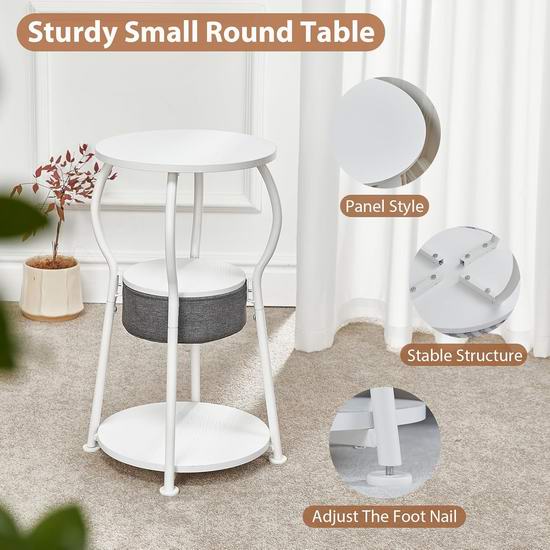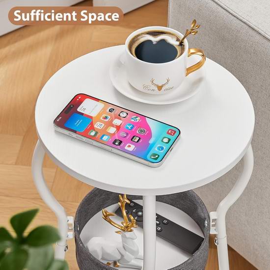 这款小巧的圆形边桌配有布艺储物蓝,方便您整理小物件,避免丢失,圆形木板可以放在储物篮上方或内部。边桌采用优质金属和环保工程MDF板材制成,桌面承重150磅,布艺储物篮承重100磅,四个桌脚均配有可调节橡胶脚垫,保护地板免受刮擦,即使地面不平也能保持桌面平稳。可用作沙发边桌、床头柜、阅读桌、转角桌、茶几、浴室桌、户外椅边桌等。