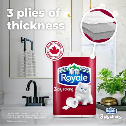 Royale 三层强韧卫生纸吸水力出色,提供额外保护,让您倍感舒适洁净。共 48 卷(等同 96 卷),每卷 165 张,总计 7,920 张,加拿大制造且通过碳中和认证。