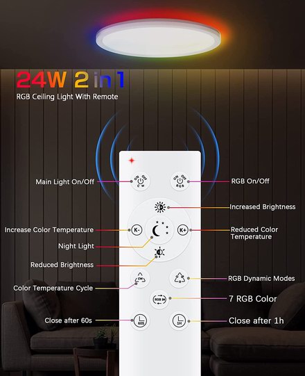 时尚圆形设计,厚度仅为2.8厘米,内置24瓦LED节能灯,同时搭载4瓦背光夜灯,采用高效LED灯珠,输出光线均匀温和不刺眼,亮度10-100%调节,具有3档色温,6种RGB动态变色模式,支持自定义单色RGB照明,营造轻松浪漫的氛围,适合客厅、卧室、浴室、厨房、走廊、楼梯、地下室和车库照明。