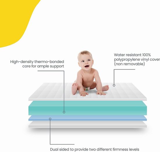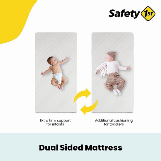 此款婴幼儿床垫通过GREENGUARD金牌认证,采用二合一设计,双面不同硬度,婴儿期使用较硬的一面,幼儿时使用较软的一面。100%聚丙烯外罩,防水防污,仅需湿巾擦拭即可去除污物。适用于标准的cribs/toddler婴儿床,外形尺寸为132.1 长 x 69.9 宽 x 12.7 厘米,加拿大制造,厂家提供10年有限保修。