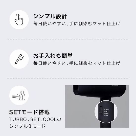 采用水润负离子技术,吹养合一,强劲气流释放千万负离子,中和静电,改善毛躁,恢复秀发柔顺光泽。全新高速电机,吹出沙龙级强劲风量,迅速带走发丝表面水分,缩短30%吹风时间,温和速干不伤发。 搭载SET模式,可以随心情变换发型。