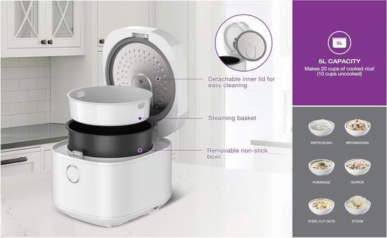 这款Salton微电脑电饭煲,采用创新的涡轮风扇,可防止溢流并排出蒸汽,提升米饭的美味。采用模糊逻辑技术,可根据米的种类和体积自动调节温度,确保每次都能煮出完美米饭。预设多种烹饪程序,包含白米/寿司米、糙米/氨基丁酸米、粥、藜麦、钢切燕麦、蒸。具有5升大容量,最多可煮20杯米饭。可拆卸内盖,方便清洁。