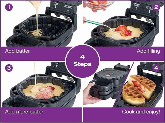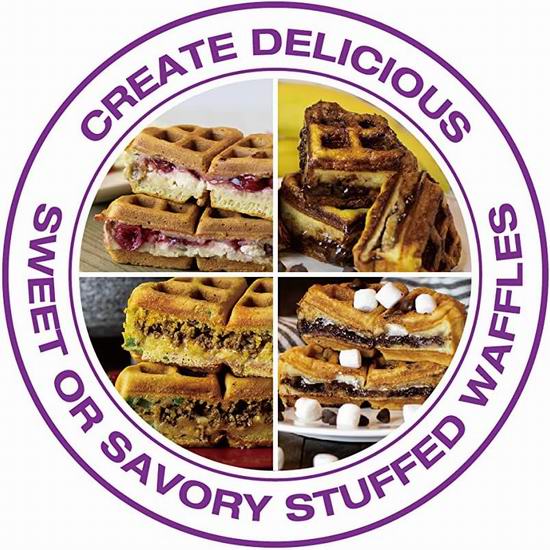 这款二合一华夫饼机,不仅可以制作夹心华夫饼,还能用可拆卸的华夫饼环快速制作普通大小的华夫饼。只需四个简单的步骤——加入面糊、添加馅料、再添加更多面糊,然后烘烤至完美,您就能立即享用美味的夹心华夫饼。其触感凉爽的手柄确保操作安全,陶瓷不粘涂层则确保每次使用后轻松清洁。