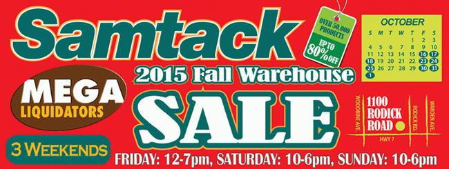 Samtack Warehouse Sale仓储特卖会将于10月16日起连续3个周末在多伦多举行,数万件电脑、家电、家具、香水2折起清仓销售,可用现金或银行借记卡支付,若使用信用卡支付将收取2.5%手续费。
