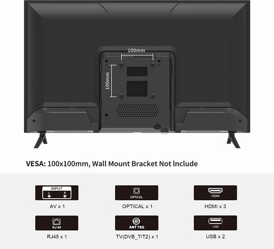 采用720P LED面板,178°视角,可访问超过Netflix、YouTube、VUDU、Facebook、Twitter、Screencast等网络流媒体和App,内置 Chromecast,支持手机投屏,配备3个HDMI接口、2个USB接口、1个AV输入。