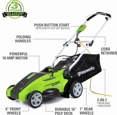 Greenworks 25142 10 安培 16英寸电动割草机 187加元(原价229加元)