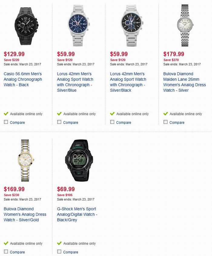 Best Buy网店销售,精选6款 Bulova、Casio、Lorus 男女时尚腕表3.5折起限时特卖并包邮,售价低至59.99加元,点击进入订购页面