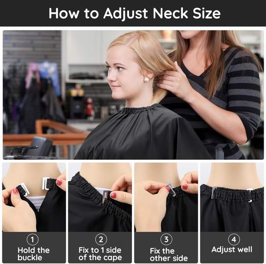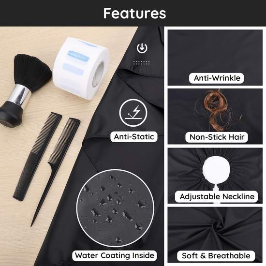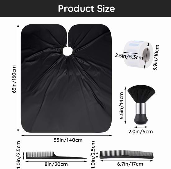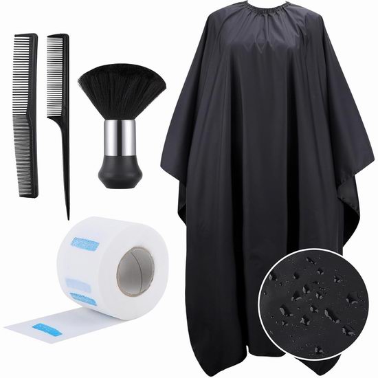 套装包含黑色理发披肩(140x160厘米);1把除尘刷;2把梳子;80根颈带,可轻松满足理发店和个人家庭使用的需求。理发披肩的领口采用松紧带和钩扣设计,可轻松调节,适合不同颈围,防止理发过程中碎发掉入领口。披肩采用柔软轻盈的涤纶面料制成,不粘发,舒适透气,并具有防水功能。