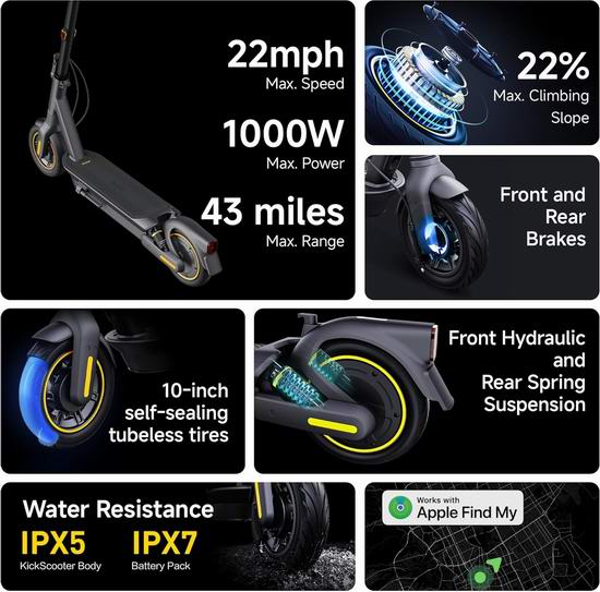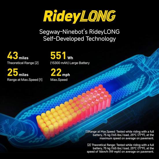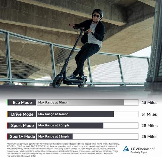 强劲的900瓦无刷电机采用全新的 RideyLONG 技术,续航里程可达70公里,最高时速可达35.4公里/小时。凭借强劲的后轮驱动、双悬挂系统、TCS 牵引力控制系统和10英寸无内胎自愈轮胎,您可以舒适地骑行于各种地形,并能自动修复4毫米或更小的胎面穿孔,尽享安心骑行体验。适合青少年和成人使用,最大承重120.2公斤。