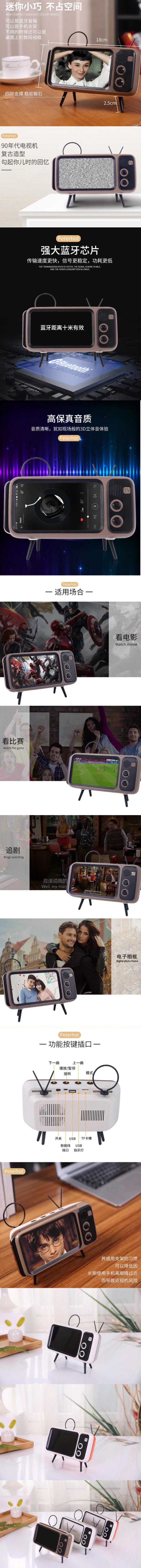 此款蓝牙音箱采用创新复古电视设计,兼容6英寸以内的智能手机,可手机一秒变身复古电视,内置4Ω3W喇叭,具有高保真音质,低音补偿设计,内置蓝牙,锂电池容量1200mAH,外形尺寸8 x 18厘米。